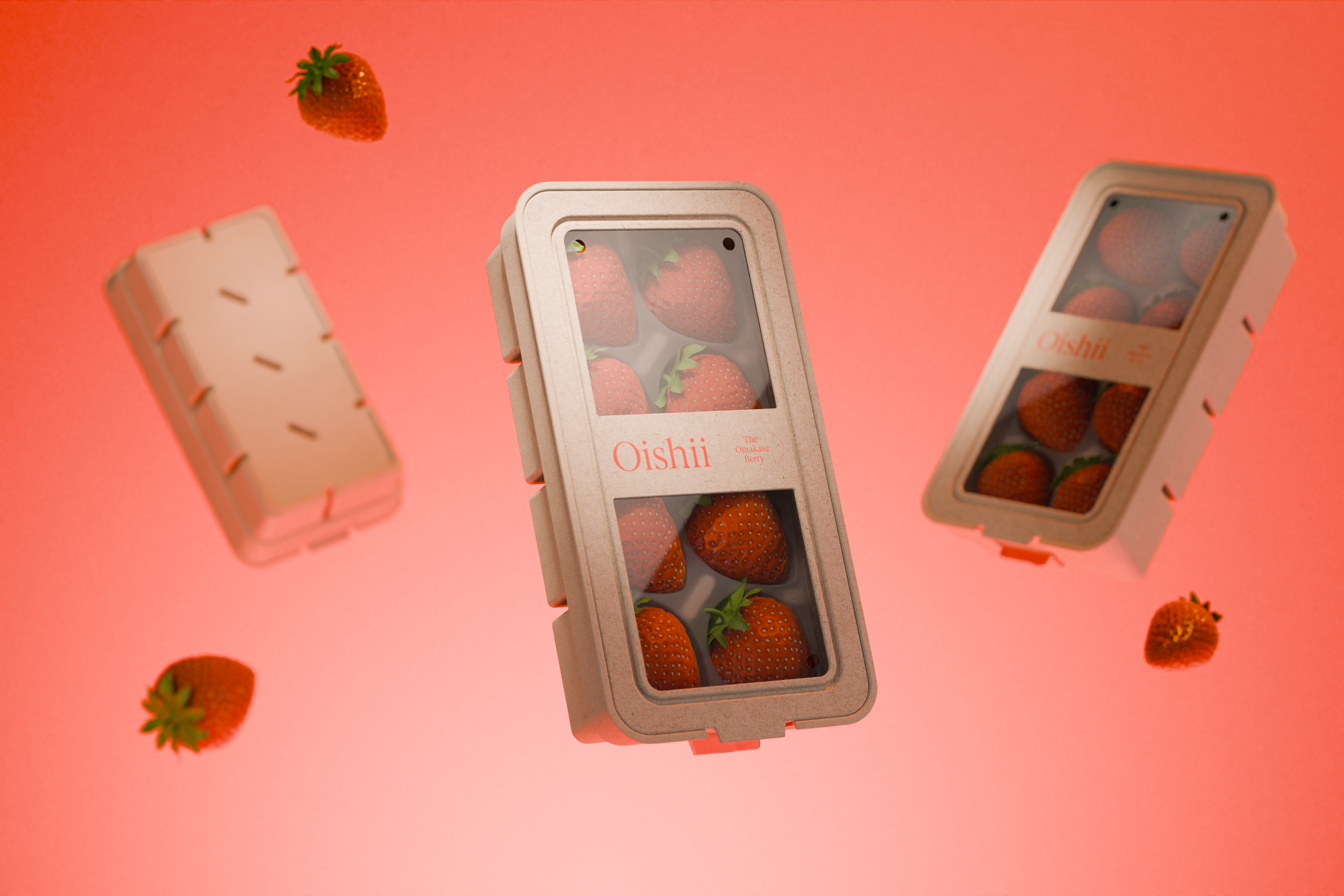 Existing packaging for Oishii consisted of a two part vacuum-formed PET packaging with a soft film "hammock" heat sealed to the tray to protect the berries. Unfortunately because of this heat sealing and film the lower half of the package could not be recycled. I also found the packages didn't stack well, tending to shift and sllde. Ultimately through market research the client determined that the all-plastic packaging also had a negative connotation to their main customer demographic and identified the need to pivot to something simultaneously sustainable and luxe.